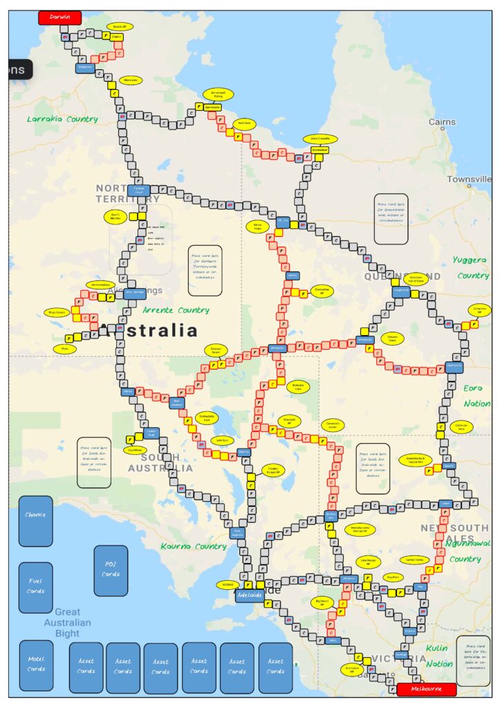 The aim of the game is to drive from Darwin to Melbourne, visiting and acquiring points of interest along the way, and achieving your mission. This requires managing your resources and dealing with incidents or events along the way. The winner is the person with the most points when the first player reaches Melbourne.